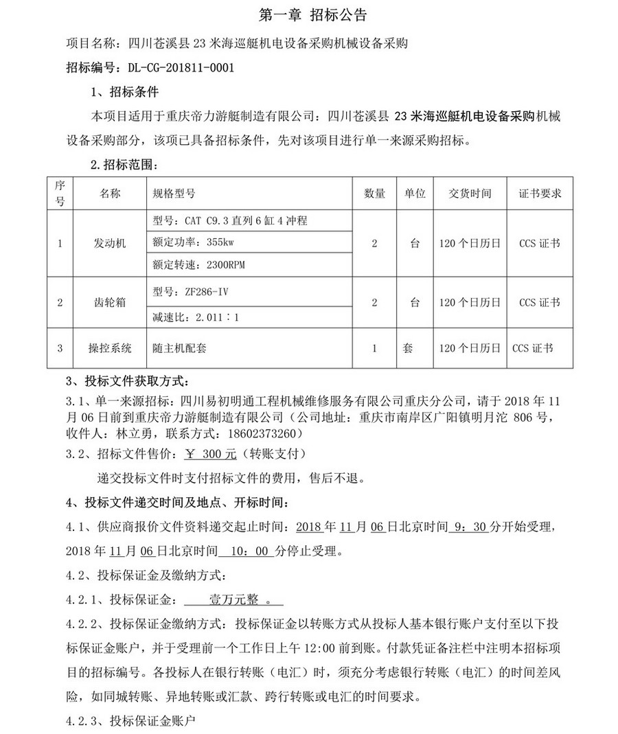 四川蒼溪縣23米海巡艇機電設備采購機械設備采購